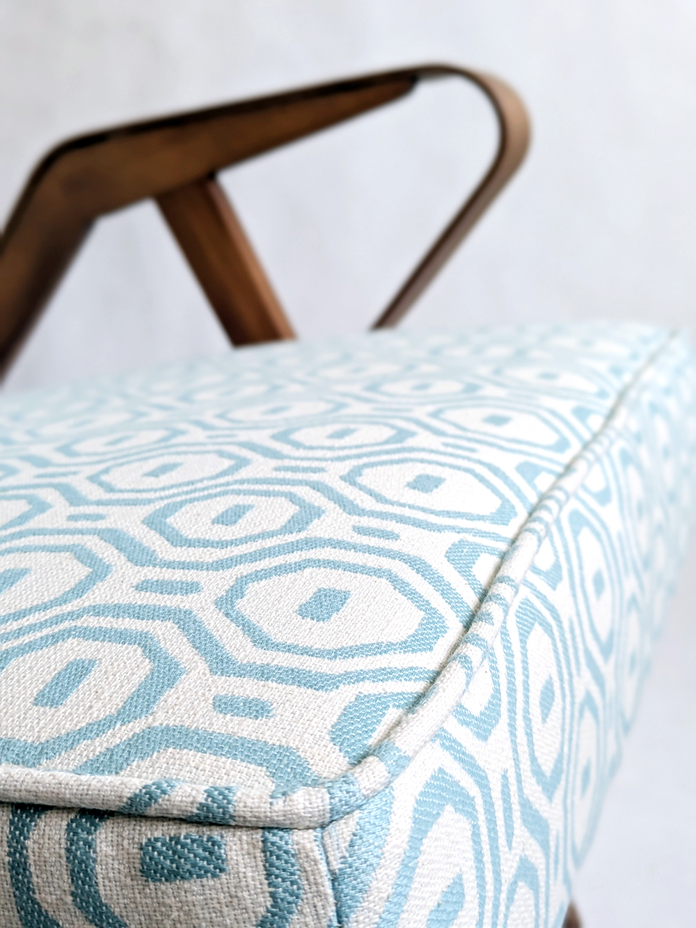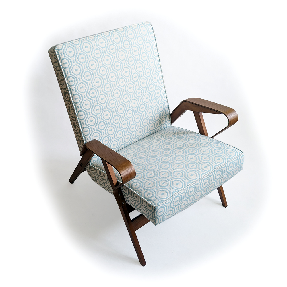 Křeslo je pečlivě zrestaurováno – dřevěná kostra je zpevněná, zbroušená, nově namořená a lakovaná. Vnitřek křesla je vyměněn za novou studenou pěnu. Anglická látka s vysokým Martindale 25,000.